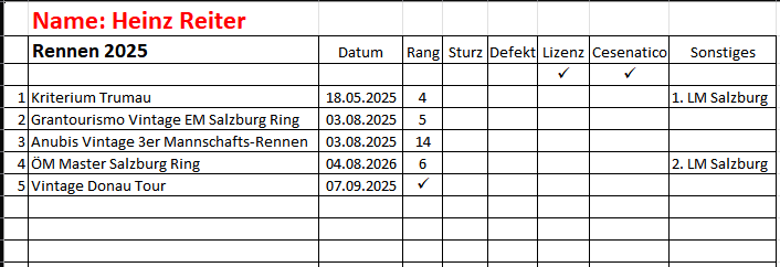 Hier die Listen von den Einsätzen unserer Rennfahrer 2025
